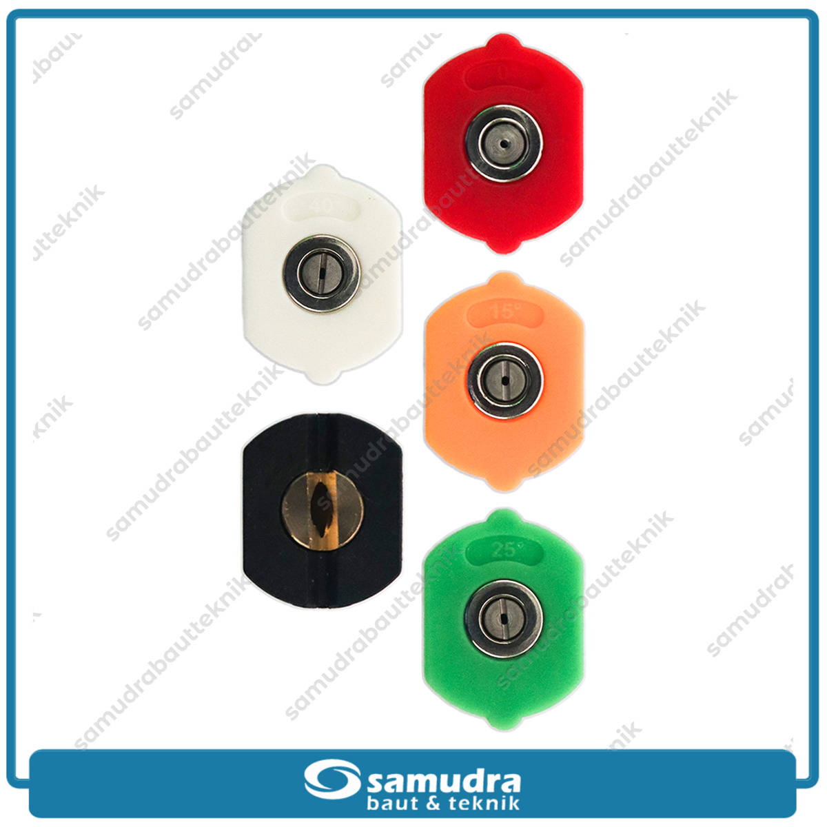- Cutting Nozzle (Warna Merah) = sebaran 0 derajat, digunakan untuk penyemprotan untuk membersihkan kerak kotoran yang sulit dibersihkan
